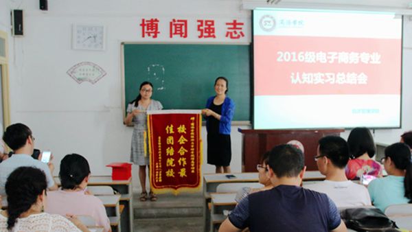 為了使人才培養(yǎng)與社會需求、行業(yè)前沿接軌,加強實踐教學(xué)環(huán)節(jié)的應(yīng)用性和創(chuàng)新性,我校經(jīng)管學(xué)院電子商務(wù)專業(yè)師生于6月8日至22日赴京東商城東盈物流園區(qū)開展專業(yè)認知實習(xí),負責(zé)京東倉庫的分揀、包裝、審核等環(huán)節(jié)的工作。由于我校師生在實習(xí)中表現(xiàn)出色,“優(yōu)秀實習(xí)生”的獲獎比例在京東合作院校中排名第二,7月4日,京東商城西北分公司人力資源部經(jīng)理李琦專程來我校贈予“校企合作最佳團結(jié)院?!卞\旗。