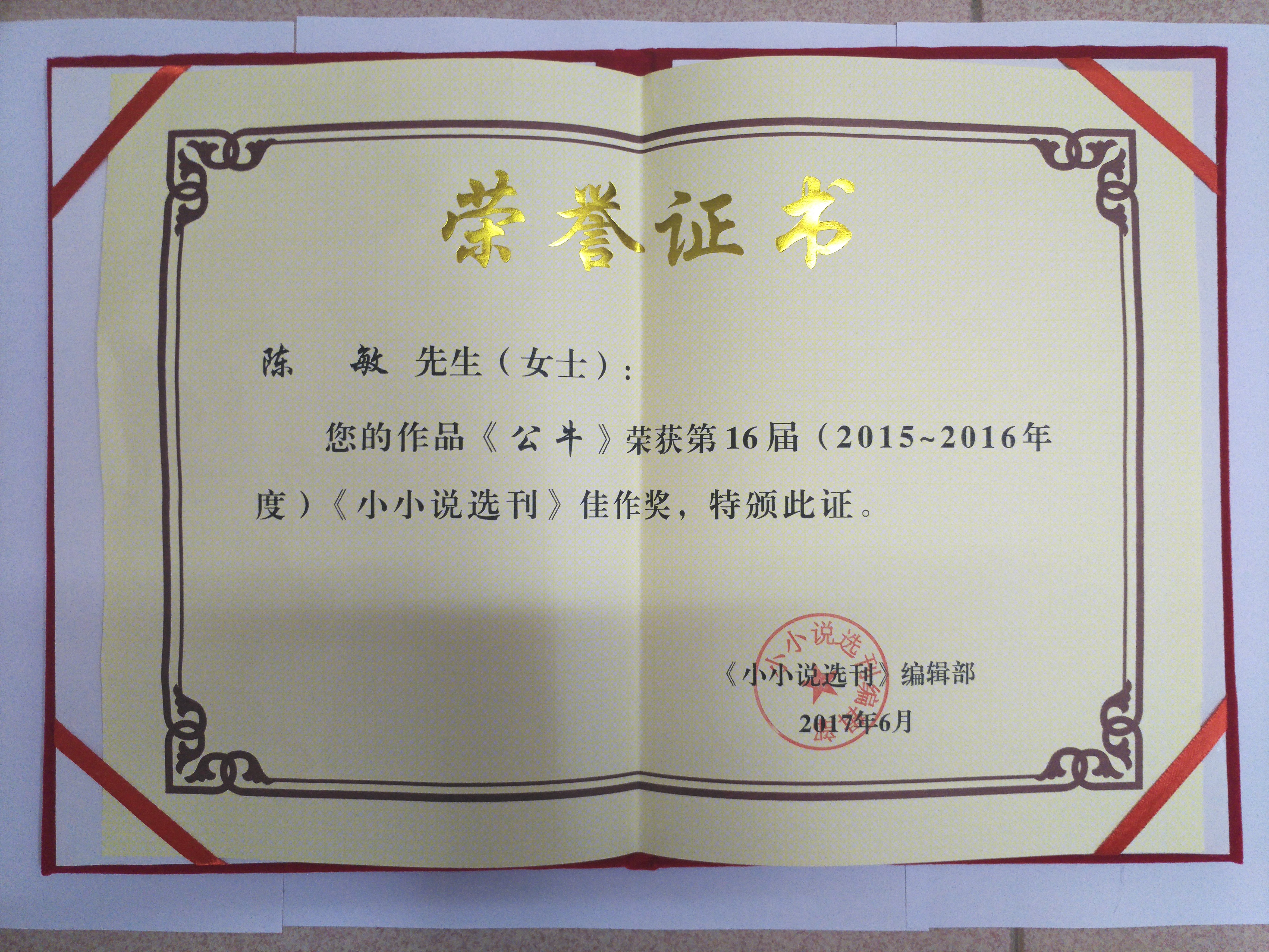 近日,由人民文學(xué)出版社、中國(guó)小說(shuō)學(xué)會(huì)、河南省作家協(xié)會(huì)、河南省文學(xué)院、鄭州市文聯(lián)主辦,鄭州小小說(shuō)文化傳媒有限公司、《小小說(shuō)選刊》《百花園》承辦的第16屆(2015-2016年度)《小小說(shuō)選刊》優(yōu)秀作品頒獎(jiǎng)典禮在鄭州舉行。我校教師陳敏的小說(shuō)《公?!吩诮f(wàn)余篇的參評(píng)小小說(shuō)中獲得第16屆《小小說(shuō)選刊》佳作獎(jiǎng),這是陳敏繼獲第九屆(2001-2002年度)《小小說(shuō)選刊》優(yōu)秀作品獎(jiǎng)(《詩(shī)祭》)之后的第二次獲獎(jiǎng)。