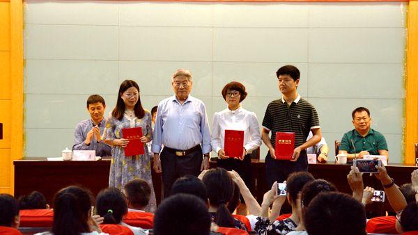 芳菲歇去何須恨,夏木陰陰正可人。6月4日,我校舉行2018年“趙鵬大院士獎(jiǎng)教金”頒獎(jiǎng)暨兼職教授聘任儀式。我?!半p聘院士”、中國(guó)科學(xué)院院士趙鵬大,校黨委書(shū)記龍治剛,校長(zhǎng)范新會(huì),副校長(zhǎng)劉寶盈、劉勇,中國(guó)地質(zhì)大學(xué)(北京)教授陳永清出席儀式。院長(zhǎng)辦公室、人事處、教務(wù)處、科技處主要負(fù)責(zé)人,化材學(xué)院教師、學(xué)生代表參加了儀式。儀式由劉勇主持。