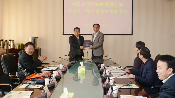 11月23日,西安外國(guó)語(yǔ)大學(xué)黨委書記鄧志輝一行5人來我??疾旖涣?,黨委書記龍治剛、黨委副書記彭虎軍陪同考察并與鄧志輝一行進(jìn)行了座談交流。
