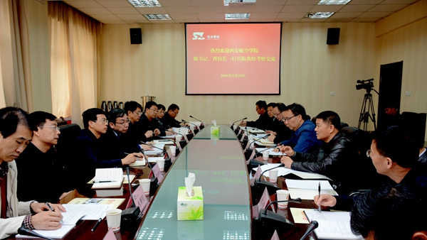 3月29日,西安航空學(xué)院黨委書記陳平社、校長(zhǎng)曹慶年、副校長(zhǎng)宋文學(xué)等一行9人來(lái)我??疾旖涣鞴ぷ?。校黨委書記龍治剛、校長(zhǎng)范新會(huì)熱情接待了陳平社、曹慶年一行。