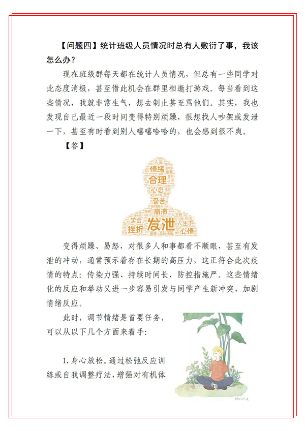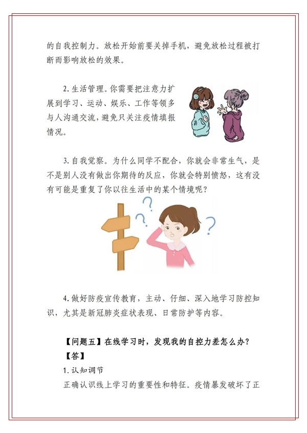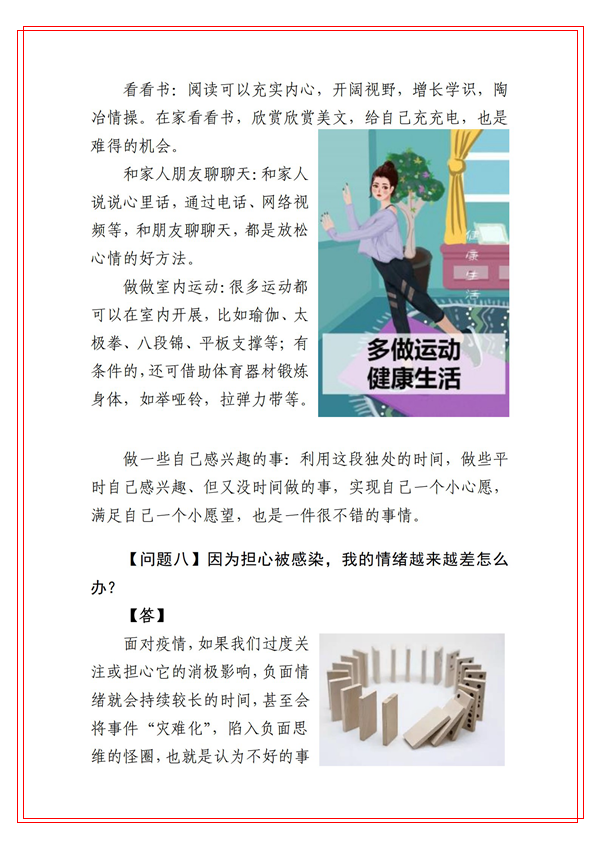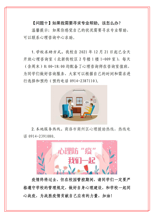 為切實(shí)貫徹學(xué)校黨委關(guān)于做好本輪新冠肺炎疫情防控工作的安排部署,堅(jiān)決打贏疫情防控阻擊戰(zhàn),健康管理學(xué)院積極發(fā)揮學(xué)科專(zhuān)業(yè)和人才優(yōu)勢(shì),組織心理學(xué)系教師迅速行動(dòng),針對(duì)防疫期間大學(xué)生常見(jiàn)的心理健康問(wèn)題,編寫(xiě)了《商洛學(xué)院大學(xué)生防疫心理健康你問(wèn)我答》。這些心理健康科普知識(shí)緊密結(jié)合我校師生實(shí)際,圖文并茂、通俗易懂,能夠有效幫助和引導(dǎo)廣大學(xué)生調(diào)試自己心理狀態(tài),維護(hù)身心健康。