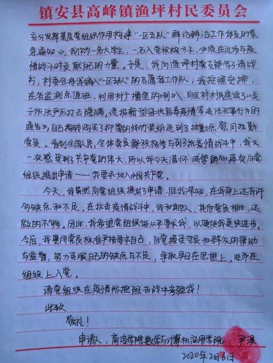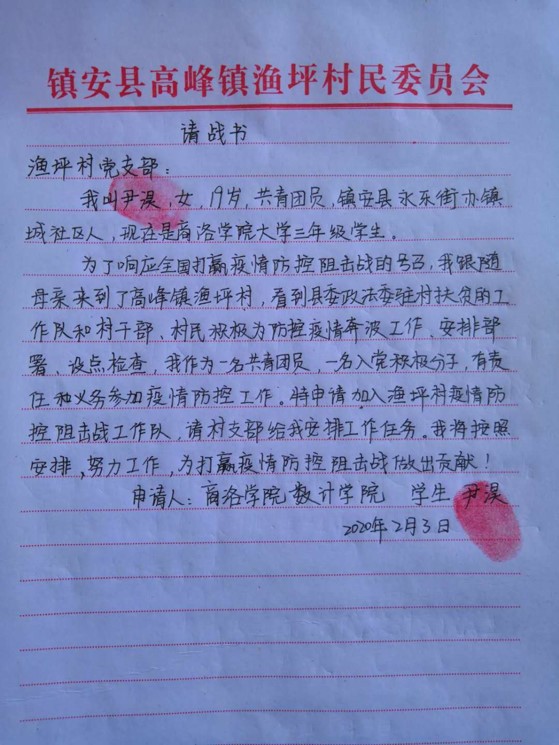 “請(qǐng)村支書給我安排工作任務(wù)”“請(qǐng)黨組織在疫情防控阻擊戰(zhàn)中考驗(yàn)我”。這擲地有聲的話語(yǔ),是商洛學(xué)院大三女學(xué)生尹淏2月3日和2月6日給高峰鎮(zhèn)漁坪村第一書記王新橋遞交的《請(qǐng)戰(zhàn)書》和《入黨申請(qǐng)書》里的兩句話。