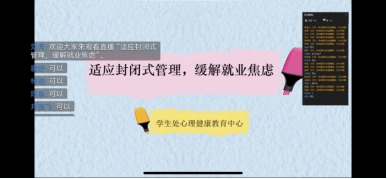 為舒緩疫情期間已返校畢業(yè)生因就業(yè)壓力而產(chǎn)生的焦慮情緒,幫助其做好心理調(diào)適和學習生活規(guī)劃,5月20日下午,我校學生處心理健康教育中心舉辦了以“適應(yīng)封閉式管理,緩解就業(yè)焦慮”為主題的線上主題講座。