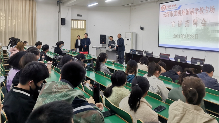 3月23日,廣東省云浮市光明外國(guó)語(yǔ)學(xué)校校長(zhǎng)梅永華、校辦主任劉偉華等一行4人來到我校,舉辦專場(chǎng)宣講招聘會(huì),為我校畢業(yè)生帶來53個(gè)就業(yè)崗位。2021屆教育類相關(guān)專業(yè)200余名畢業(yè)生參加了招聘會(huì)。這是我校積極踐行“以生為本”工作理念,充分克服疫情對(duì)畢業(yè)生就業(yè)帶來的不利影響,為畢業(yè)生舉辦的小規(guī)模、多場(chǎng)次招聘會(huì)中一場(chǎng)。