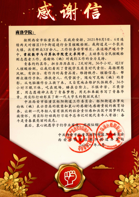近日,中共西安市臨潼區(qū)櫟陽街道工作委員會、街道辦事處向我校發(fā)來感謝信。信中熱情贊揚了我校學(xué)生黨文卓在櫟陽街道全民核酸檢測志愿服務(wù)工作中所作出的貢獻,同時對我校教育培養(yǎng)優(yōu)秀學(xué)生表示誠摯感謝。