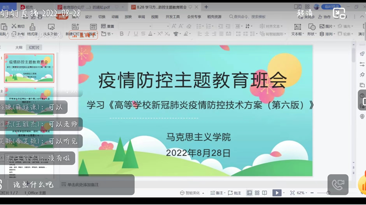 各二級(jí)學(xué)院結(jié)合工作實(shí)際,精心策劃了富有學(xué)院特色的主題班會(huì)。馬克思主義學(xué)院組織師生錄制宣講視頻,針對(duì)疫情防控技術(shù)方案中有關(guān)精神和具體要求進(jìn)行廣泛宣傳。人文學(xué)院以“你我同心協(xié)力,共筑疫情防線”為題,從新修訂的疫情防控技術(shù)方案入手,深入淺出地從“我該怎么做”再次強(qiáng)調(diào)了落實(shí)疫情防控政策的具體細(xì)節(jié)。數(shù)計(jì)學(xué)院重點(diǎn)開展了收心教育,幫助學(xué)生盡快從舒適的暑假生活轉(zhuǎn)到緊張忙碌的線上學(xué)習(xí),號(hào)召全體學(xué)生“收收心 聚聚神”。電信學(xué)院以“勠力同心共戰(zhàn)疫,踔厲奮發(fā)向未來”為主題,分年級(jí)、分專業(yè)圍繞疫情防控、心理健康、職業(yè)發(fā)展、學(xué)業(yè)規(guī)劃、課業(yè)指導(dǎo)、實(shí)習(xí)實(shí)訓(xùn)、學(xué)科競(jìng)賽、文體活動(dòng)等與學(xué)生進(jìn)行了交流討論?;膶W(xué)院師生們分享了疫情發(fā)生以來感受到的“中國(guó)精神”和“中國(guó)故事”,開展了一次生動(dòng)的疫情防控和愛國(guó)主義教育。生物學(xué)院從班風(fēng)學(xué)風(fēng)建設(shè)入手,鼓勵(lì)同學(xué)們結(jié)合自身特點(diǎn),科學(xué)做好學(xué)年規(guī)劃,積極籌備考證、參加科創(chuàng)比賽、備戰(zhàn)考研和就業(yè),以更加積極認(rèn)真的態(tài)度對(duì)待學(xué)業(yè)和生活。建工學(xué)院以“新學(xué)期、新氣象、新目標(biāo)”為主題,傳達(dá)線上教學(xué)工作的各項(xiàng)部署和注意事項(xiàng),號(hào)召畢業(yè)班學(xué)生搶抓“金九銀十”的就業(yè)機(jī)遇,自信果敢、積極就業(yè)。經(jīng)管學(xué)院教師與全體學(xué)生“相聚云端”,分享了線上高效學(xué)習(xí)專業(yè)課的“小技巧”和“小妙招”,叮囑同學(xué)們務(wù)必每日監(jiān)測(cè)自身健康、做好日常防護(hù)。藝術(shù)學(xué)院重點(diǎn)學(xué)習(xí)了違反疫情防控規(guī)定典型案例,以案例為警示,引導(dǎo)全體學(xué)生牢筑戰(zhàn)“疫”防火墻。健康學(xué)院緊密結(jié)合疫情防控的生動(dòng)實(shí)踐,向?qū)W生解讀國(guó)家疫情防控政策和部署,分享抗疫感人故事,開展心理輔導(dǎo),引導(dǎo)學(xué)生樹立共克時(shí)艱的責(zé)任擔(dān)當(dāng)意識(shí)。