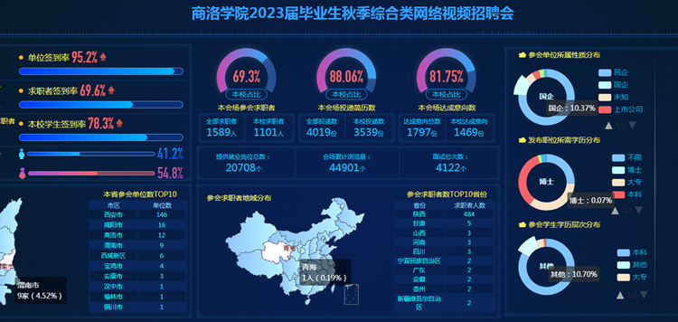 本次網(wǎng)絡(luò)視頻招聘會(huì)共有省內(nèi)外320余家用人單位報(bào)名參會(huì),提供涉及制造業(yè)、建筑業(yè)、房地產(chǎn)業(yè)、教育、文化體育和娛樂(lè)業(yè)、信息傳輸軟件和信息技術(shù)服務(wù)業(yè)、科學(xué)研究和技術(shù)服務(wù)業(yè)等10大行業(yè)領(lǐng)域的對(duì)口、優(yōu)質(zhì)就業(yè)崗位6200余個(gè)。共吸引1589余名校內(nèi)外畢業(yè)生參會(huì),在線訪問(wèn)量達(dá)到44901人(次),畢業(yè)生累計(jì)投遞簡(jiǎn)歷4019份。