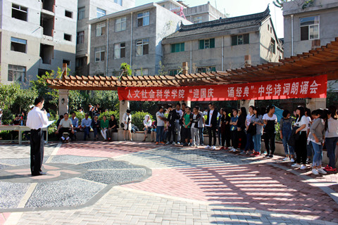 為深入學(xué)習(xí)貫徹習(xí)近平總書記系列重要講話精神,傳承中華民族優(yōu)秀傳統(tǒng)文化,9月21日,人文社會(huì)科學(xué)學(xué)院在莘子苑舉辦了“迎國慶,誦經(jīng)典”中華詩詞朗誦會(huì),以朗誦詩歌的形式迎接國慶佳節(jié)的來臨。人文社會(huì)科學(xué)學(xué)院全體師生參加了本次活動(dòng)。