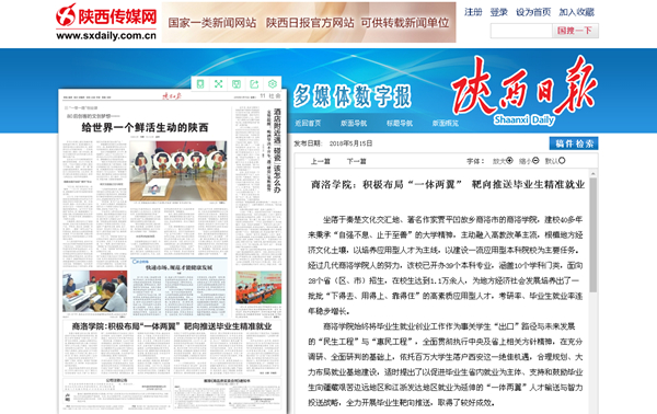 5月15日,《陜西日報》第11版以《商洛學(xué)院:積極布局“一體兩翼” 靶向推送畢業(yè)生精準就業(yè)》為題,對我校就業(yè)工作進行了專題報道。