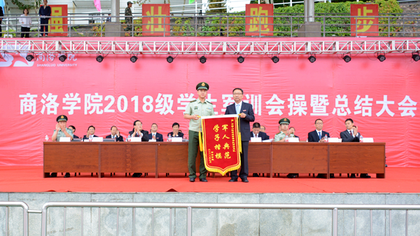 大會(huì)在莊嚴(yán)雄壯的國(guó)歌聲中拉開(kāi)帷幕。校黨委書(shū)記龍治剛對(duì)全體承訓(xùn)教官不畏風(fēng)雨、認(rèn)真負(fù)責(zé)、辛勤努力的付出表示感謝,并代表學(xué)校向中國(guó)人民武警部隊(duì)商洛支隊(duì)贈(zèng)送了寫(xiě)有“軍人典范 學(xué)子楷?!钡腻\旗。