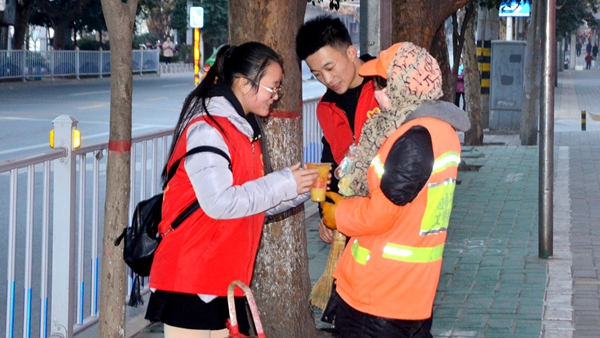 11月25日,我校團委組織青年志愿者協(xié)會、化學(xué)工程與現(xiàn)代材料學(xué)院40余名志愿者到商洛市中心廣場、萬事達廣場、黃沙橋沿路為環(huán)衛(wèi)工人送暖心早餐。