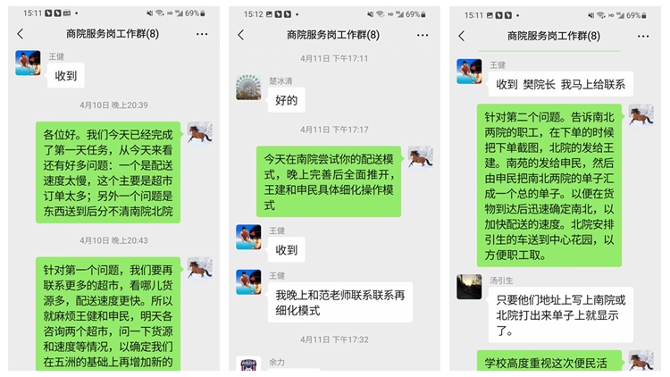 ——及時(shí)響應(yīng),火速集結(jié)。由于疫情突然而至,學(xué)校管控封閉也比較緊急,大部分教職工來(lái)不及采購(gòu)生活必需品。根據(jù)屬地疾控部門(mén)“只進(jìn)不出、嚴(yán)禁聚集”的疫情防控政策,市區(qū)保障民生的超市只能將我校生活保障物品配送至校門(mén)口。為了打通“最后100米”,黨員樊景博同志擔(dān)任總指揮,范申民、王健、湯引生、余力、謝謙、史軍輝、楚冰清等黨員教職工迅速成立便民志愿服務(wù)隊(duì),分為南院、北院兩個(gè)區(qū)域小組,幫助教職工解決“購(gòu)物難,買(mǎi)菜難”等問(wèn)題。