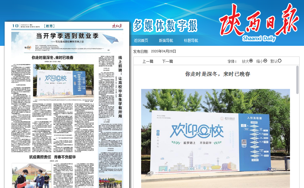 按照省教育廳規(guī)定,4月27日各高??梢蚤_始安排畢業(yè)年級(含高職和本、碩、博)、醫(yī)學(xué)專業(yè)、醫(yī)學(xué)類院校和有科研任務(wù)的學(xué)生錯時(shí)錯峰返校。近日,陜西日報(bào)記者深入省內(nèi)高校,采訪報(bào)道了包括我校在內(nèi)的數(shù)所高校,精心做好疫情防控和開學(xué)準(zhǔn)備工作,在明媚春光中,敞開校門,擁抱歸來學(xué)子。其中涉及我校內(nèi)容如下: