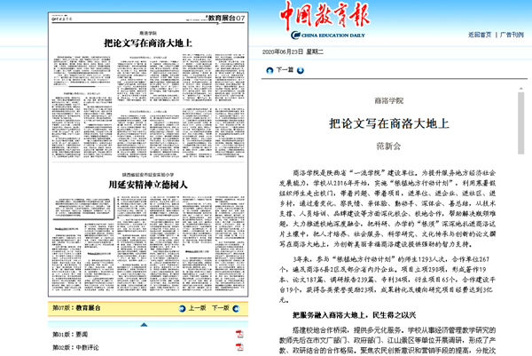 校長(zhǎng)范新會(huì)在《中國(guó)教育報(bào)》2020年6月23日教育展臺(tái)版面發(fā)表署名文章《把論文寫在商洛大地上》,全文如下: