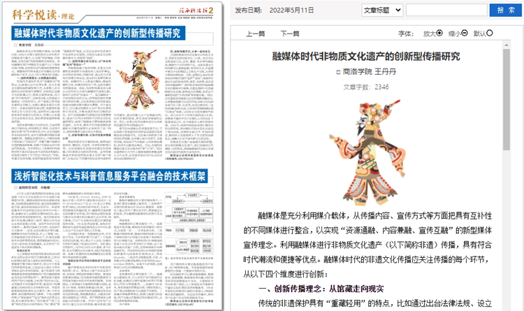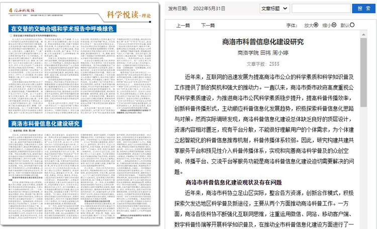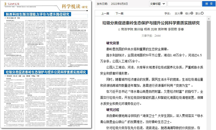 5月份以來,我校教師袁訓(xùn)鋒、田祎、王丹丹先后在《陜西科技報》理論版刊發(fā)《垃圾分類促進(jìn)秦嶺生態(tài)保護(hù)與提升公民科學(xué)素質(zhì)實(shí)踐研究》《商洛市科普信息化建設(shè)研究》《融媒體時代非物質(zhì)文化遺產(chǎn)的創(chuàng)新型傳播研究》三篇文章,圍繞秦嶺生態(tài)保護(hù)、科普信息化建設(shè)、非物質(zhì)遺產(chǎn)創(chuàng)新傳播等主題,介紹我??蒲蟹?wù)地方實(shí)踐成果和經(jīng)驗(yàn)。文章主要內(nèi)容如下: