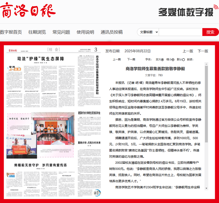 商洛籍青年李靜毅渭河救人不幸犧牲的感人事跡經(jīng)媒體報(bào)道后,在商洛學(xué)院師生中引起廣泛反響。該校發(fā)出《關(guān)于深入學(xué)習(xí)李靜毅同志崇高精神暨開展愛心捐贈(zèng)的倡議書》,師生積極響應(yīng),短時(shí)間內(nèi)募集愛心捐款2.4萬多元。8月19日,該校相關(guān)領(lǐng)導(dǎo)赴商州區(qū)金陵寺鎮(zhèn)崔坪村將善款送至李靜毅父母手中,傳遞全校師生對(duì)英雄家庭的關(guān)懷。