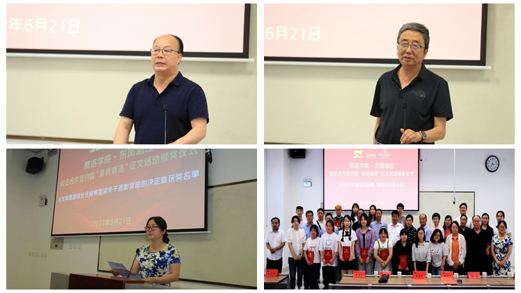 6月21日,人文學(xué)院與陜西東鳳酒莊有限公司共同舉辦校企合作簽約儀式暨“愛我商洛”征文活動頒獎活動?!渡搪迦請笊纭房偩庉嬆蠒谩⑸搪迨凶鲄f(xié)主席魚在洋、丹鳳縣政府教育督導(dǎo)室主任白寬虎、丹鳳縣科技統(tǒng)籌中心主任李書軍、丹鳳縣委黨校副校長程毅飛、商洛學(xué)院科技處處長程敏、商洛學(xué)院教務(wù)處副處長李會榮、陜西東鳳酒莊有限公司總經(jīng)理王青寧、商洛學(xué)院人文學(xué)院全體黨政領(lǐng)導(dǎo)出席。征文活動獲獎?wù)吆蜕搪鍖W(xué)院人文學(xué)院師生代表共一百余人參加了活動?;顒佑扇宋膶W(xué)院副院長馬英群主持。