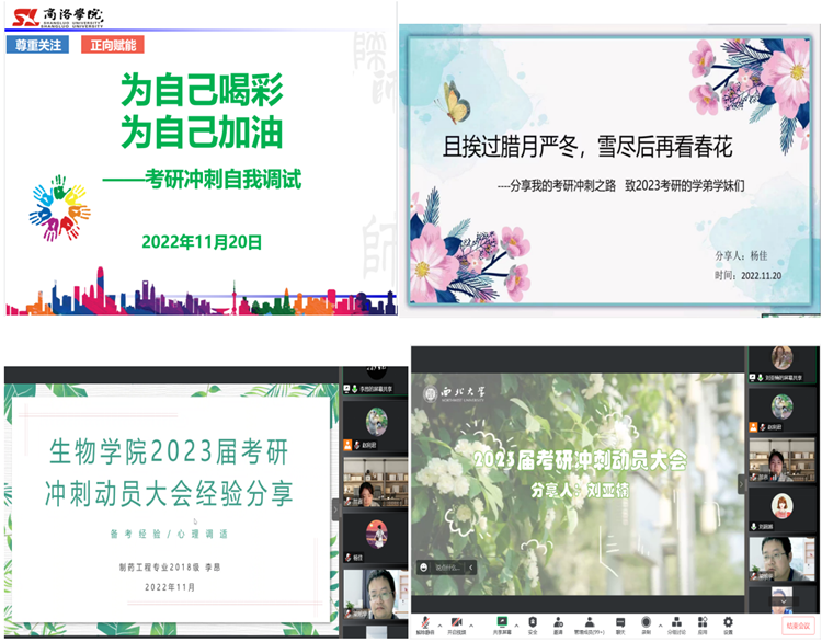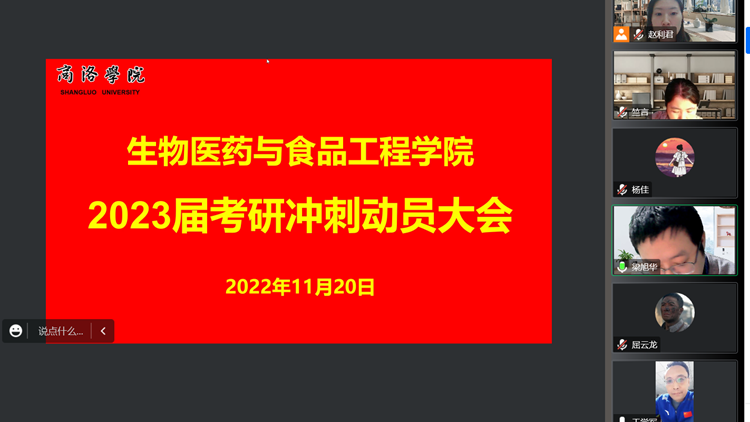 為了充分調(diào)動2023屆畢業(yè)生考研積極性,盡早明確考研目標(biāo)與就業(yè)方向, 11月20日晚,生物學(xué)院通過釘釘線上平臺組織召開了2023屆考研沖刺動員大會。學(xué)院黨政領(lǐng)導(dǎo)、教師代表及2023屆考研學(xué)生參加會議。
