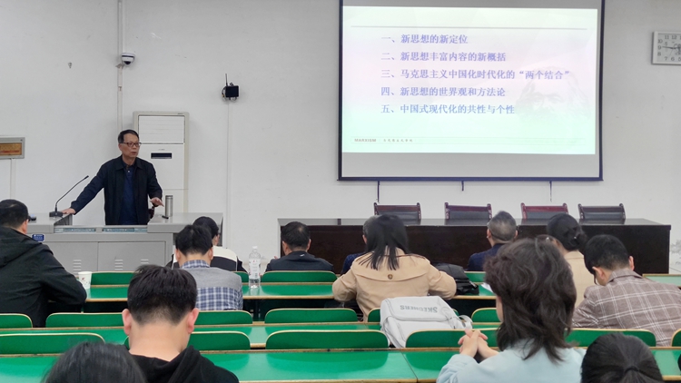 閻樹群教授以《黨的二十大的重大理論創(chuàng)新》為題,緊密結(jié)合新思想的新定位、新思想豐富內(nèi)容的新概括、馬克思主義中國化時(shí)代化的“兩個(gè)結(jié)合”、新思想的世界觀和方法論、中國式現(xiàn)代化的共性和個(gè)性等五個(gè)方面,逐層展開,對(duì)黨的二十大的重大理論創(chuàng)新成果進(jìn)行了引經(jīng)據(jù)典、深入淺出地講解。他強(qiáng)調(diào),要深入理解習(xí)近平新時(shí)代中國特色社會(huì)主義思想的核心內(nèi)涵,堅(jiān)持讀原著、學(xué)原文、悟原理,持續(xù)推進(jìn)馬克思主義基本原理同中國具體實(shí)際相結(jié)合、同中華優(yōu)秀傳統(tǒng)文化相結(jié)合,準(zhǔn)確把握中國式現(xiàn)代化本質(zhì)要求的深刻內(nèi)涵,奮力譜寫全面建設(shè)社會(huì)主義現(xiàn)代化國家新篇章。