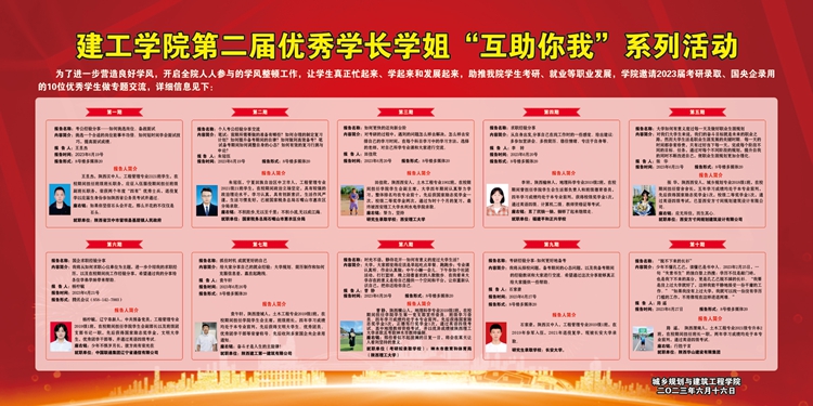 為扎實(shí)推進(jìn)“學(xué)生活動(dòng)富起來(lái) 學(xué)習(xí)任務(wù)重起來(lái) 教風(fēng)學(xué)風(fēng)嚴(yán)起來(lái)”,充分發(fā)揮優(yōu)秀畢業(yè)生傳幫帶作用,6月19日至27日,城鄉(xiāng)規(guī)劃與建筑工程學(xué)院開(kāi)展第二屆優(yōu)秀學(xué)長(zhǎng)學(xué)姐“互助你我”系列活動(dòng),遴選2023屆考研錄取、國(guó)央企錄用的優(yōu)秀畢業(yè)生為2020級(jí)全體學(xué)生、2021級(jí)部分學(xué)生做專(zhuān)題交流。