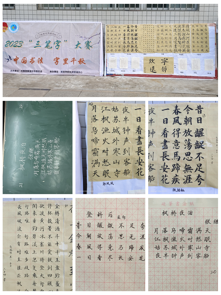 本次大賽自6月初開(kāi)始,面向全校學(xué)生,從前期報(bào)名、動(dòng)員、院級(jí)初賽,到校級(jí)決賽歷時(shí)近一個(gè)月,共有600余人參加初賽,60人進(jìn)入校級(jí)決賽。決賽分為鋼筆組、粉筆組和毛筆組三個(gè)賽道。參賽題目、內(nèi)容均選自我國(guó)各類優(yōu)秀古詩(shī)詞。