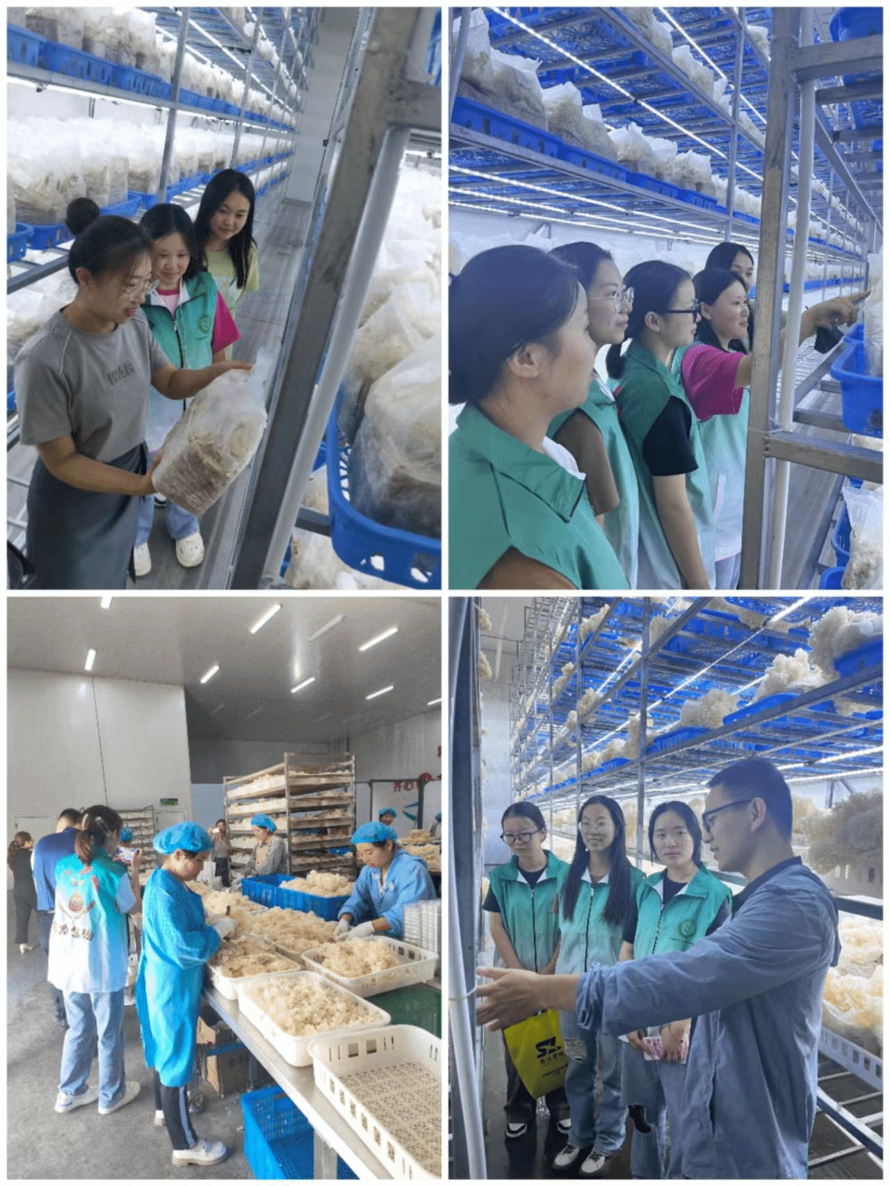 團(tuán)隊(duì)一行參觀(guān)了繡球菌工廠(chǎng)內(nèi)裝拌、凈化、接種、培養(yǎng)、出菇、采摘、包裝等車(chē)間。在參觀(guān)過(guò)程中,教師及繡球菌工廠(chǎng)負(fù)責(zé)人詳細(xì)地為學(xué)生們講解各個(gè)車(chē)間主要的工作任務(wù)、生產(chǎn)原理、儀器設(shè)備、操作要點(diǎn)、人員配置及車(chē)間整體規(guī)劃布置和企業(yè)經(jīng)營(yíng)理念,幫助學(xué)生深入了解繡球菌的生產(chǎn)加工工藝流程。此外,在繡球菌的培養(yǎng)及包裝車(chē)間內(nèi),學(xué)生通過(guò)親身實(shí)踐加深了對(duì)繡球菌生產(chǎn)工藝的認(rèn)識(shí),紛紛表示受益匪淺。