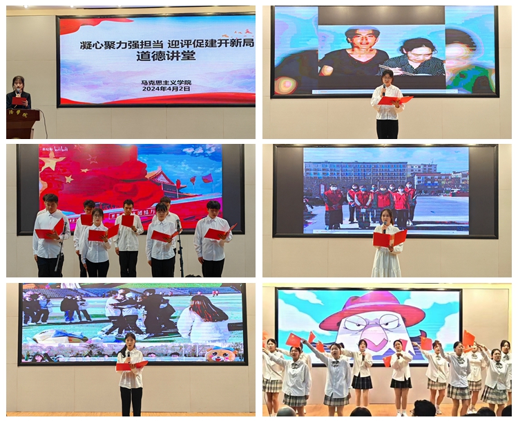 為激發(fā)師生干事創(chuàng)業(yè)熱情,以昂揚(yáng)的精神風(fēng)貌迎接教育部審核評(píng)估,4月2日,馬克思主義學(xué)院在學(xué)校圖書館一樓報(bào)告廳舉辦了“凝心聚力強(qiáng)擔(dān)當(dāng),迎評(píng)促建開新局”道德講堂。校黨委委員、宣傳部部長王霄飛蒞臨指導(dǎo),馬克思主義學(xué)院黨政領(lǐng)導(dǎo)、全體教師及學(xué)生黨員、入黨積極分子、團(tuán)學(xué)干部參加了活動(dòng)。