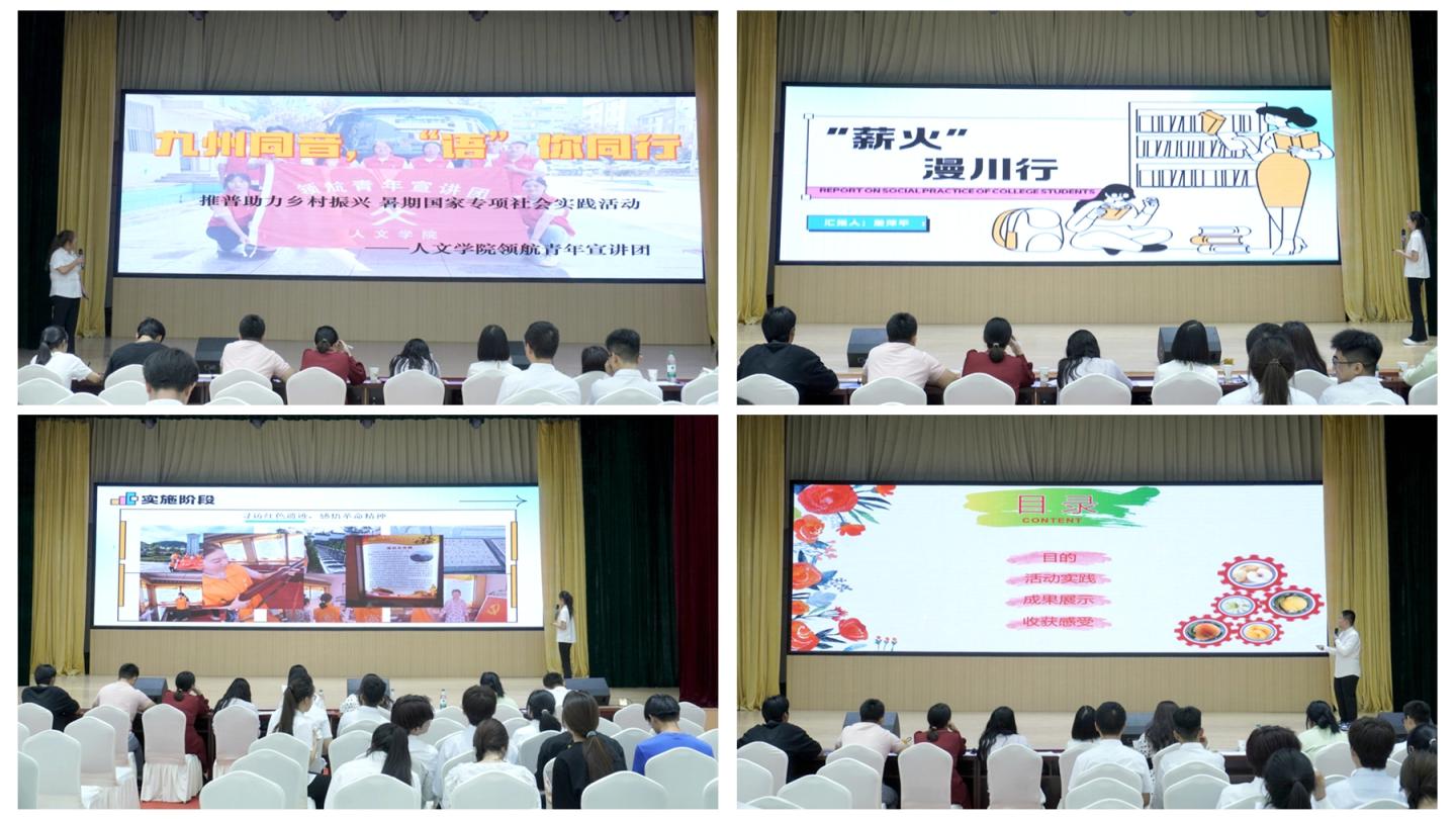 44支校級立項實踐團隊負責人通過圖文、現(xiàn)場講解、短視頻等方式,圍繞活動內(nèi)容、活動方式、實踐成果、個人感悟等方面進行了精彩的匯報,充分體現(xiàn)了各團隊發(fā)揮專業(yè)特色,深入鄉(xiāng)村、扎根基層,在黨史教育、鄉(xiāng)村振興、文化傳承、社會服務、禁毒宣傳、普通話推廣、七彩假期等領域的青春風采和所感所獲,在領略祖國發(fā)展偉大成就、鄉(xiāng)村變革、惠民生暖民心舉措的生動對比中不斷增強學生的“聽黨話、跟黨走”的堅定信心。