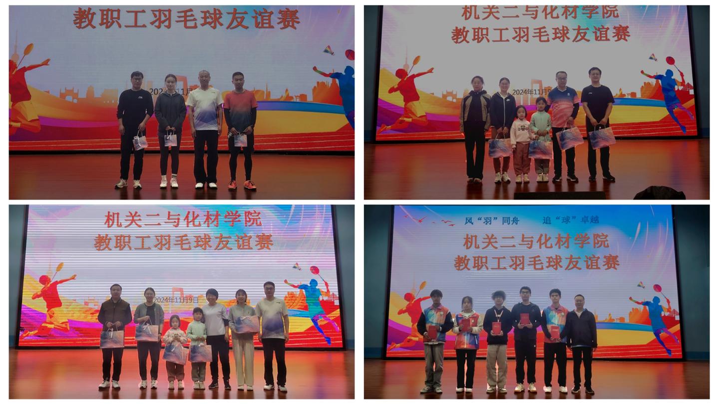 本次比賽采用中國羽毛球協(xié)會最新審定的《羽毛球競賽規(guī)則》,分為小組循環(huán)賽和淘汰賽兩個階段。最終劉彥春、劉雷和李莎獲得一等獎,李斌、劉俊、劉萍和吳曉云獲得二等獎,王洋、劉金虎、田莎莎、吳芳和樊雪梅獲得三等獎。比賽過程中還涌現(xiàn)出曹家豪、王質(zhì)盛、曹瑜凡等優(yōu)秀學(xué)生志愿者。在熱烈的掌聲中,機關(guān)二分會主席?人事處處長李斌宣讀獲獎名單,人文學(xué)院原副院長楊軍、化材學(xué)院黨委副書記·紀委書記·副院長曹寶月,教務(wù)處副處長李春、王洋分別為獲獎教職工和優(yōu)秀志愿者頒獎。