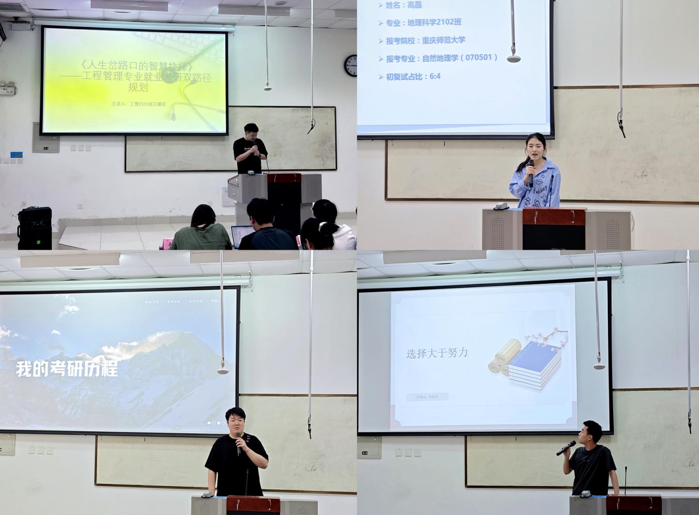 來自2025屆考研成功的四位學生代表,聚焦科學規(guī)劃、心態(tài)調節(jié)與資源利用等方面,分享了分層學習計劃、真題演練、定期復盤等復習策略。他們鼓勵師弟師妹們保持良好的考研心態(tài),合理疏導備考壓力。在互動答疑環(huán)節(jié),同學們就院校選擇、跨專業(yè)考研、時間管理等核心問題踴躍提問。與會老師和考研成功代表結合實戰(zhàn)經驗,針對性解答備考重點、復習節(jié)奏把控等關鍵內容,給出詳實且實用的建議。