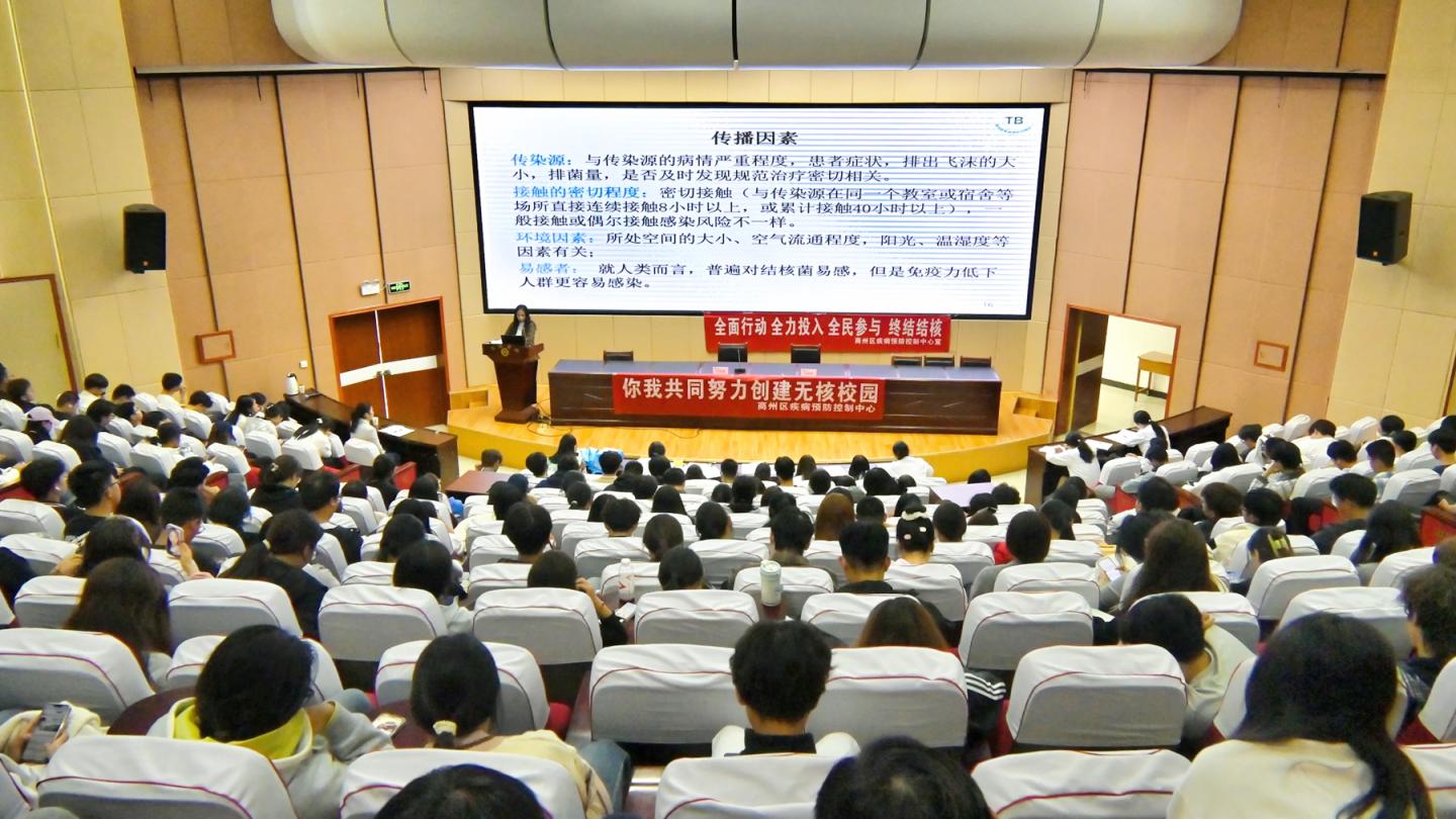 張曉榮首先從結(jié)核病危害、結(jié)核病的流行環(huán)節(jié)、結(jié)核病診斷治療預(yù)防三方面展開,結(jié)合生動案例向師生進行了深入講解,呼吁師生養(yǎng)成良好衛(wèi)生習(xí)慣,加強體育鍛煉,提高抵御疾病的能力。隨后,張曉榮向師生明確了結(jié)核病潛伏感染者的定義,她指出,結(jié)核潛伏感染并不等同于罹患結(jié)核病,預(yù)防性治療是降低結(jié)核病潛伏感染者發(fā)展為結(jié)核病患者的有效手段。