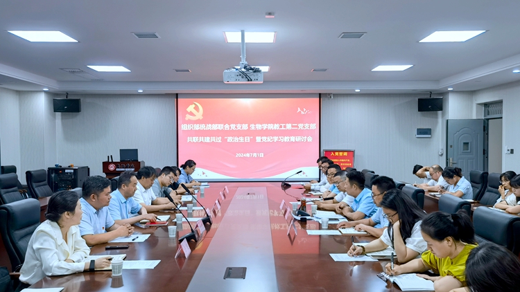 為促進(jìn)基層黨支部?jī)?yōu)勢(shì)互補(bǔ)、共同提高,提升基層黨組織建設(shè)水平,推動(dòng)黨紀(jì)學(xué)習(xí)教育走深走實(shí),根據(jù)學(xué)?;鶎狱h支部共建共聯(lián)活動(dòng)安排,7月1日,機(jī)關(guān)一黨總支組織部統(tǒng)戰(zhàn)部聯(lián)合黨支部與生物學(xué)院教工第一、第二黨支部一同開(kāi)展共過(guò)“政治生日”暨黨紀(jì)學(xué)習(xí)教育研討活動(dòng)。組織部統(tǒng)戰(zhàn)部聯(lián)合黨支部書(shū)記張向東為全體黨員講授專題黨課。三個(gè)黨支部32名教工黨員參加活動(dòng)?;顒?dòng)由生物學(xué)院黨委書(shū)記楊力主持。
