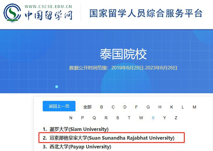 宣素那他皇家大學(xué)(Suan Sunandha Rajabhat University)是中國教育部認(rèn)證、首批推薦泰國重點(diǎn)高校、中國教育部涉外監(jiān)管信息網(wǎng)推薦留學(xué)院校。大學(xué)設(shè)有14個(gè)院系以及附屬小學(xué)與中學(xué),本科、碩士、博士專業(yè)學(xué)位學(xué)科120余個(gè),現(xiàn)有全日制在校生29000余名。宣大連續(xù)20年在泰國皇家大學(xué)中綜合排名第1位;是教育部留學(xué)服務(wù)中心戰(zhàn)略合作伙伴,長期與國內(nèi)外多所國際知名院校長期進(jìn)行學(xué)術(shù)合作與交流,出席中國-東盟及“一帶一路”教育展、中國國際巡回教育展等。