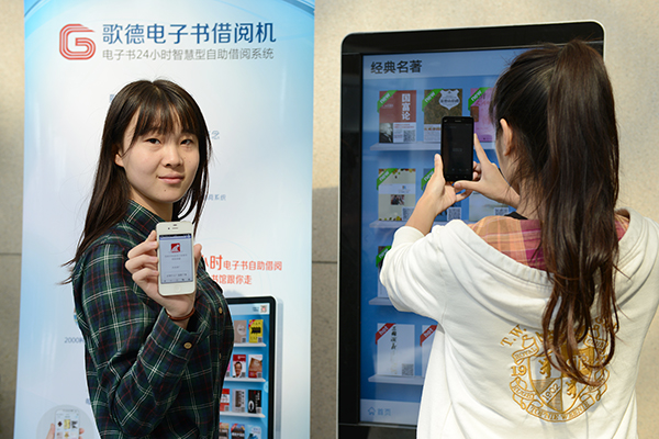 近日,記者看到我校圖書(shū)館大廳看到了一部“大手機(jī)”,不少讀者拿手機(jī)在屏幕上翻閱掃描